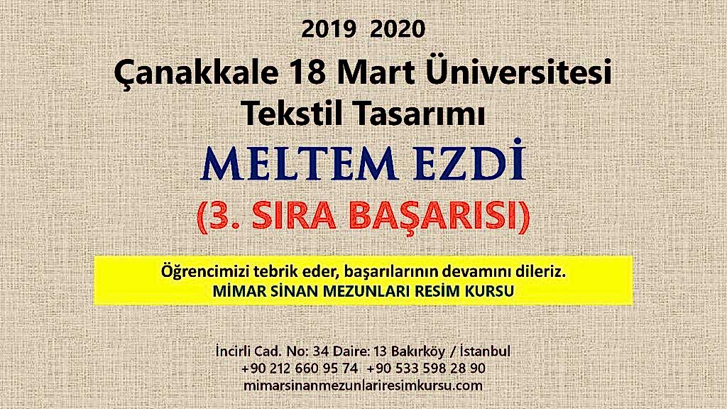 ***** Nehir KAYA Çanakkale 18 Mart Üniversitesi Güzel Sanatlar Fakültesi'nde Tekstil ve Moda Tasarımı alanında 5. sırada yer alıyor. Trakya Üniversitesi, Resim bölümünde 10. sırada yer aldı. Trakya Üniversitesi'nde Grafik Tasarımı bölümü, 16. sırayı kazandı. Azerbaycan'da sanat kurslarıyla yaratıcılığınızı geliştirin, yeni beceriler keşfedin ve öğrenmeye hazır olun!
