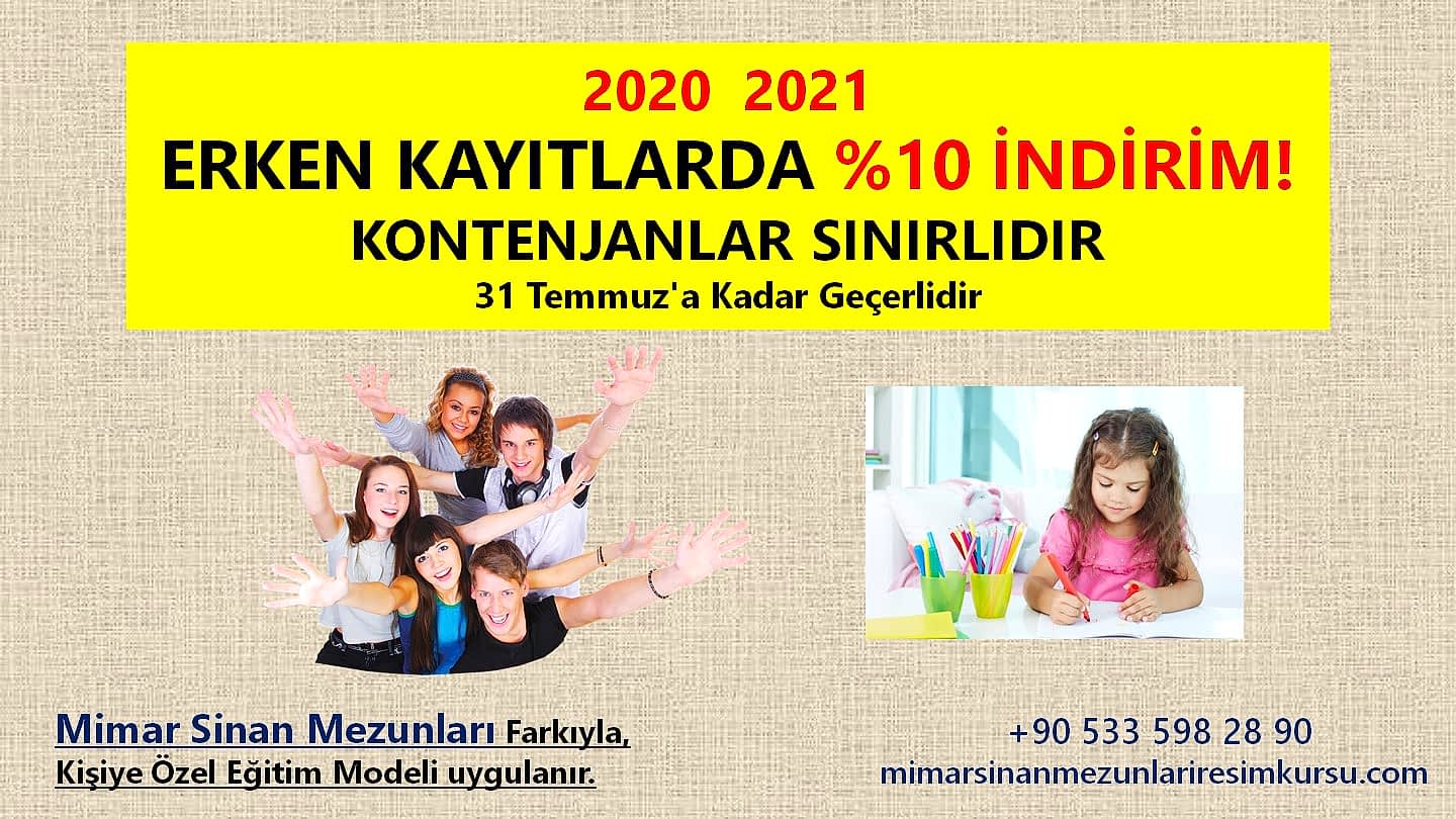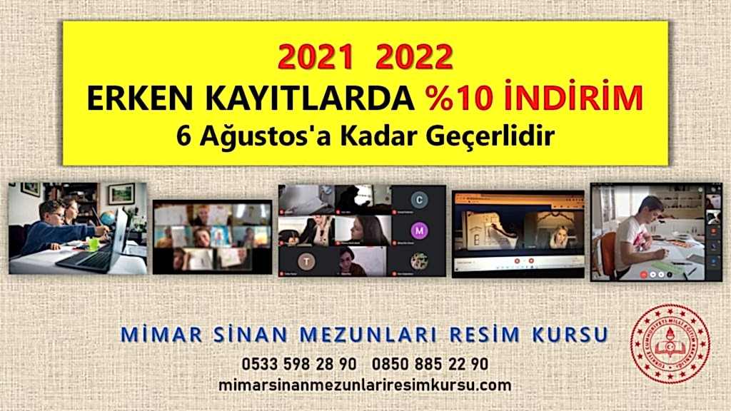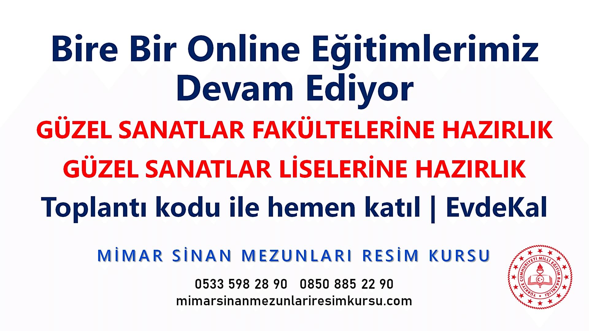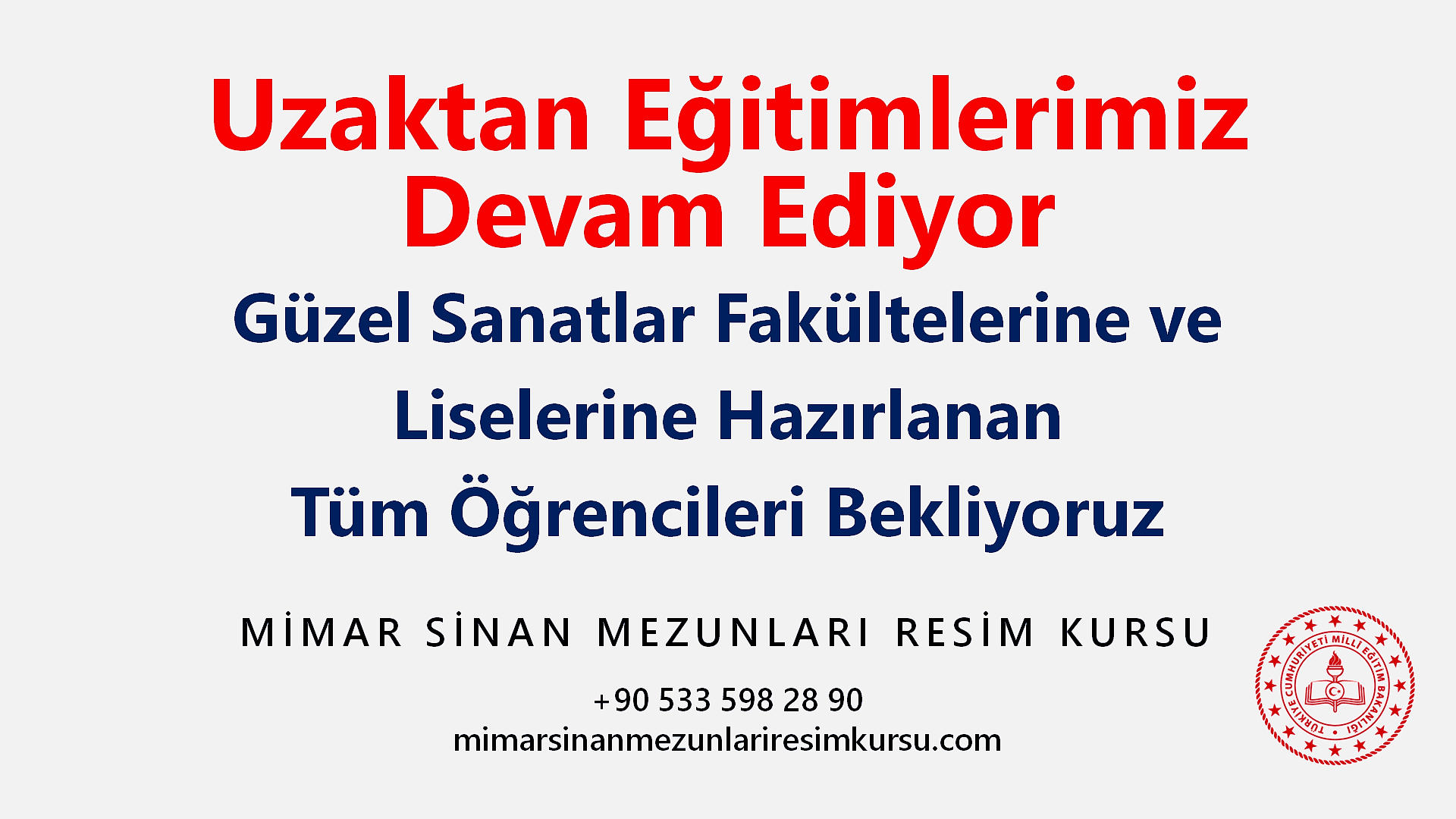 Kurumumuza MEB’den gelen resmi yazı nedeniyle 4 Ocak 2021 tarihine kadar Güzel Sanatlar Fakülte / Liselerinin yetenek sınavlarına hazırlık ve Çocuklarla Resim kurslarımız sadece online olarak devam edecektir.