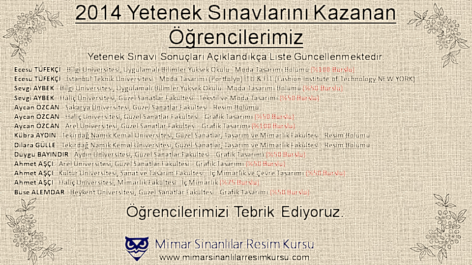 YGS'den 140 ve üzeri puan alan gençlerimiz! Yüksek bir puan alamadım diye üzülmeyin! Güzel Sanatlar Fakültelerinin yetenek sınavıyla öğrenci alan bölümlerini (İç mimarlık, Grafik Tasarımı, Moda Tasarımı vb.) Mimar Sinan Mezunları Resim Kursu'nun uzman eğitimcileriyle hazırlanarak kazanabilirsiniz. Hızlandırılmış kurs programımızla sizi sınav maratonuna hazırlayabiliriz. Hiç vakit kaybetmeden kurslarımıza katılın ve Mimar Sinan'lı olmanın farkıyla Devlet Üniversitelerinde veya Özel Üniversitelerde(Burslu) okuma şansı elde edin.
