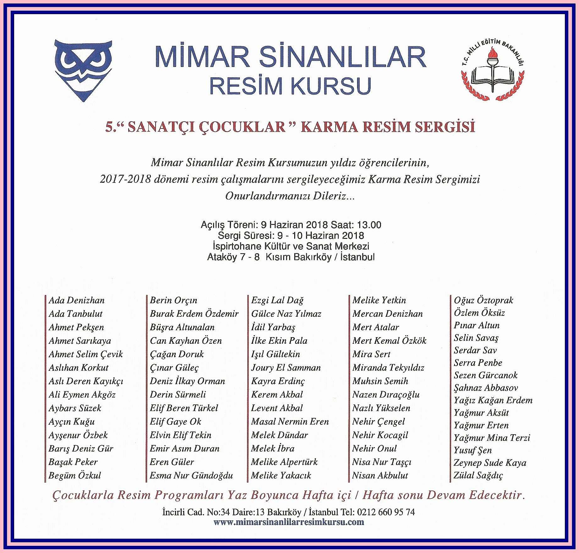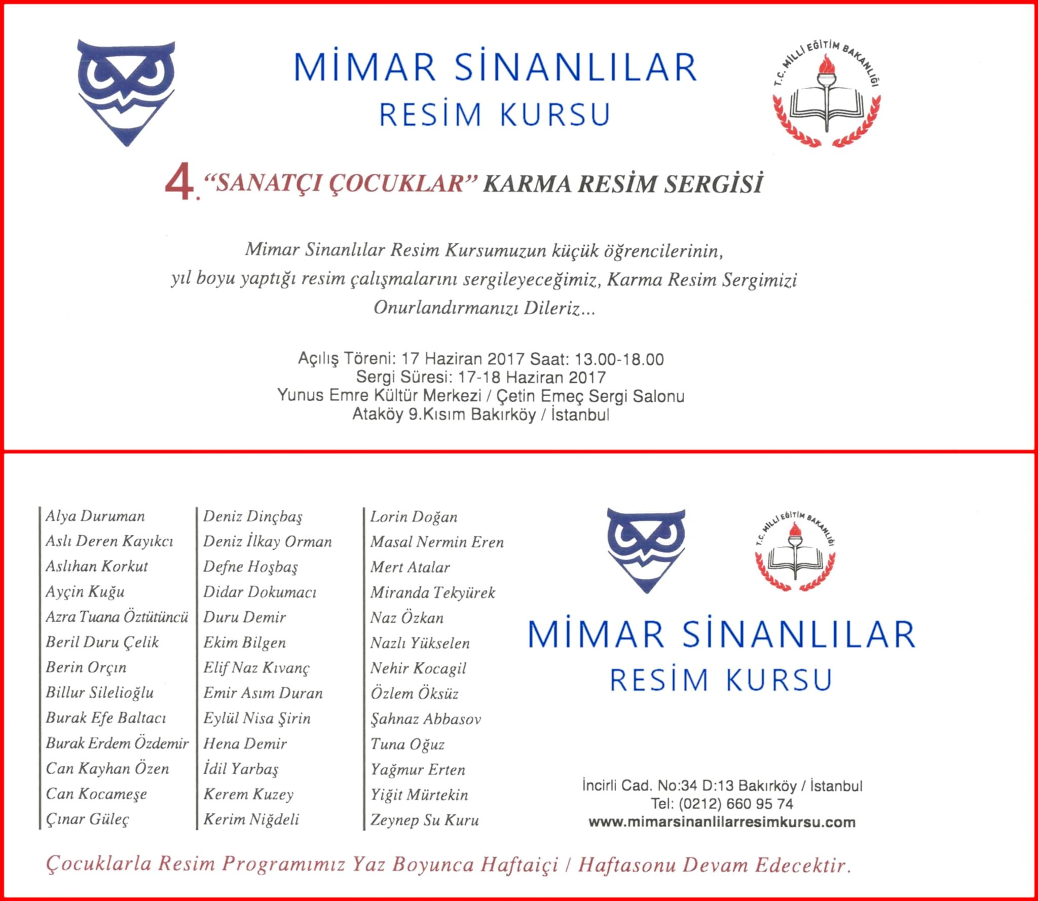 Mimar Sinan Mezunları Resim Kursu ekibi olarak 2. "Sanatçı Çocuklar" Karma Resim Sergisine göstermiş olduğunuz ilgiden ötürü tüm velilere ve siz değerli misafirlerimize çok teşekkür ederiz.