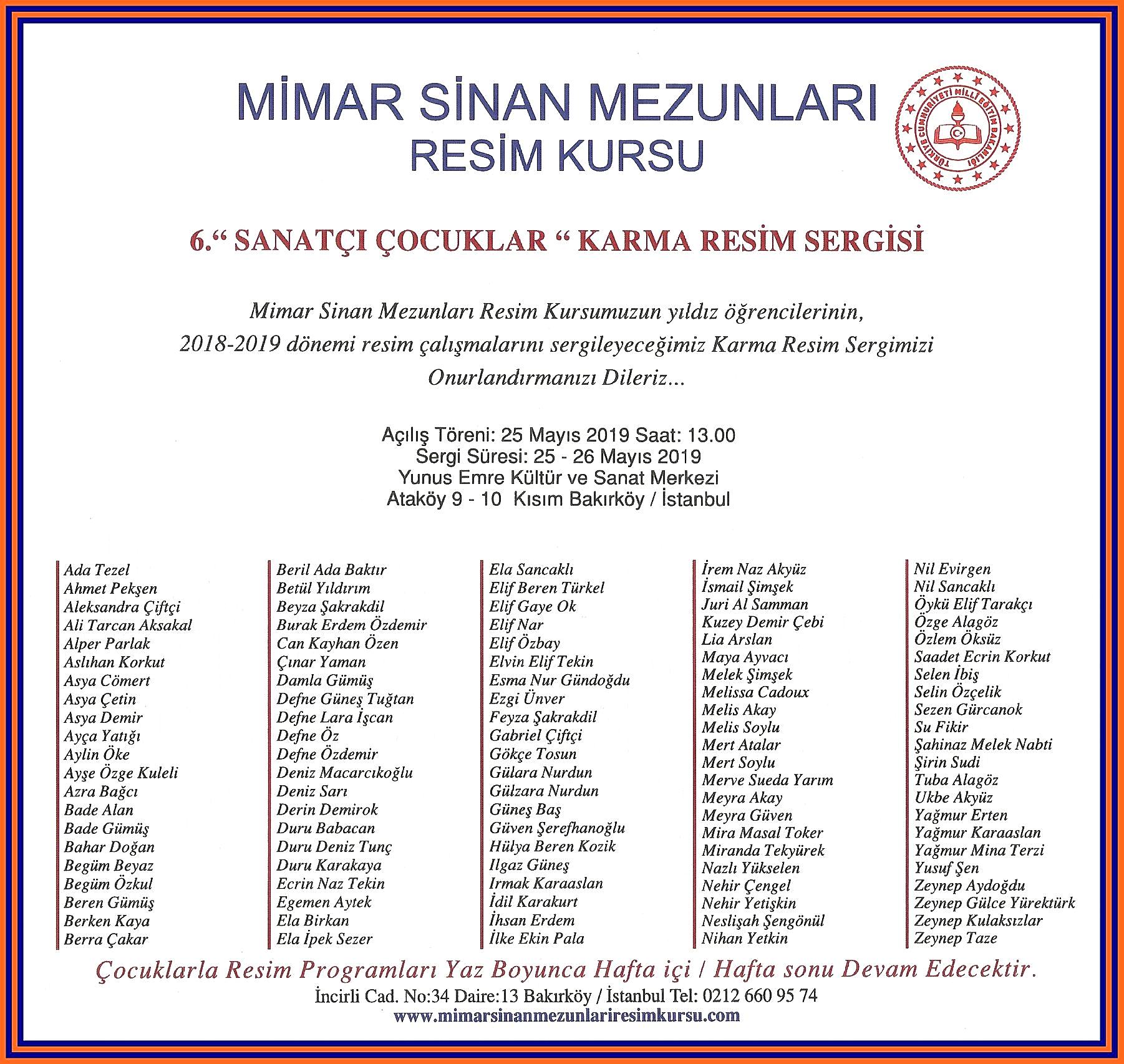 Mimar Sinan Mezunları Resim Kursu ekibi olarak 6. "Sanatçı Çocuklar" Karma Resim Sergisine göstermiş olduğunuz ilgiden ötürü değerli velilerimize ve misafirlerimize çok teşekkür ederiz.