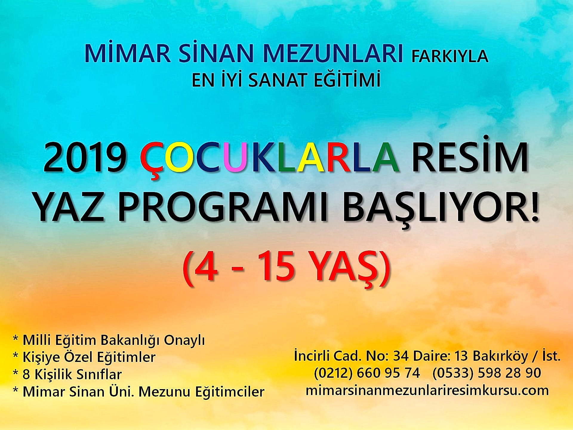 Mimar Sinan Mezunları Resim Kursu Yaz Programlarında, çocukların hayal güçlerini, sözel ve sayısal zekâlarını geliştirici özel teknik ve yöntemler kullanır. Alanında uzun yıllar çalışmış, eğitim formasyonuna sahip sanat eğitmenleri tarafından bu yöntemler uygulanır. Kişiye özel eğitim modeli ile 8 kişilik sınıflarda özel ders kalitesinde Mimar Sinan Güzel Sanatlar Üniversitesi mezunu hocalarımız tarafından eğitim verilir.