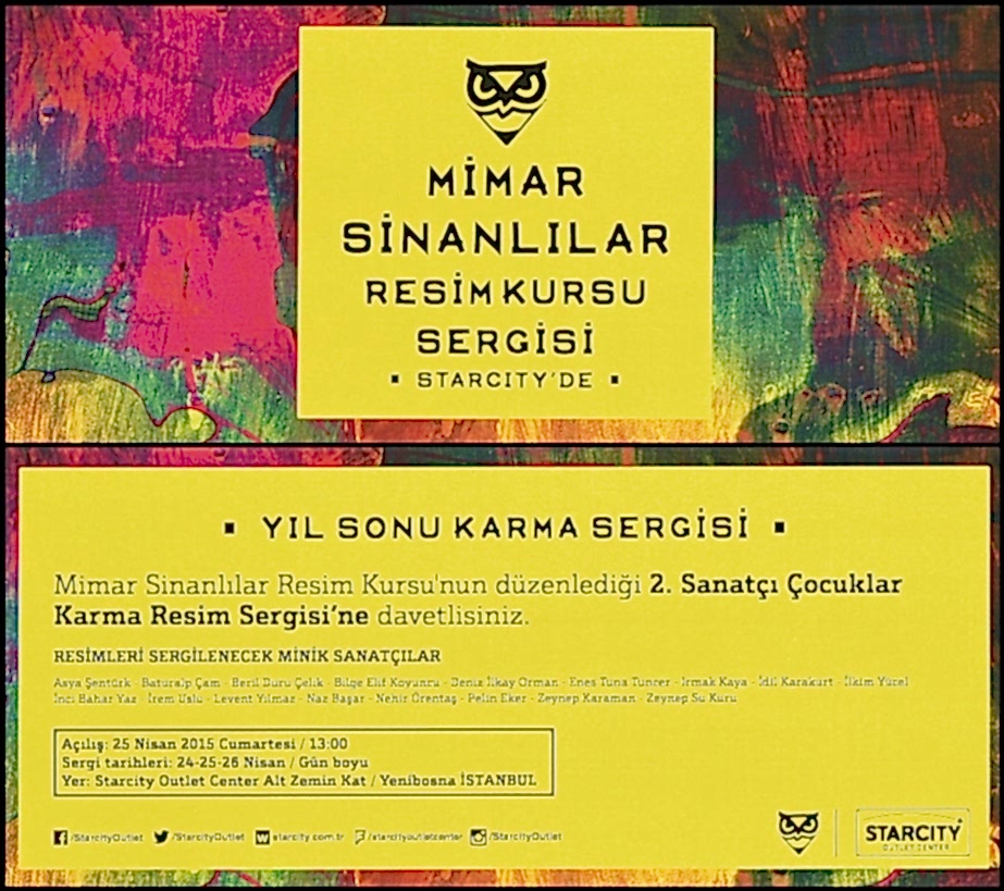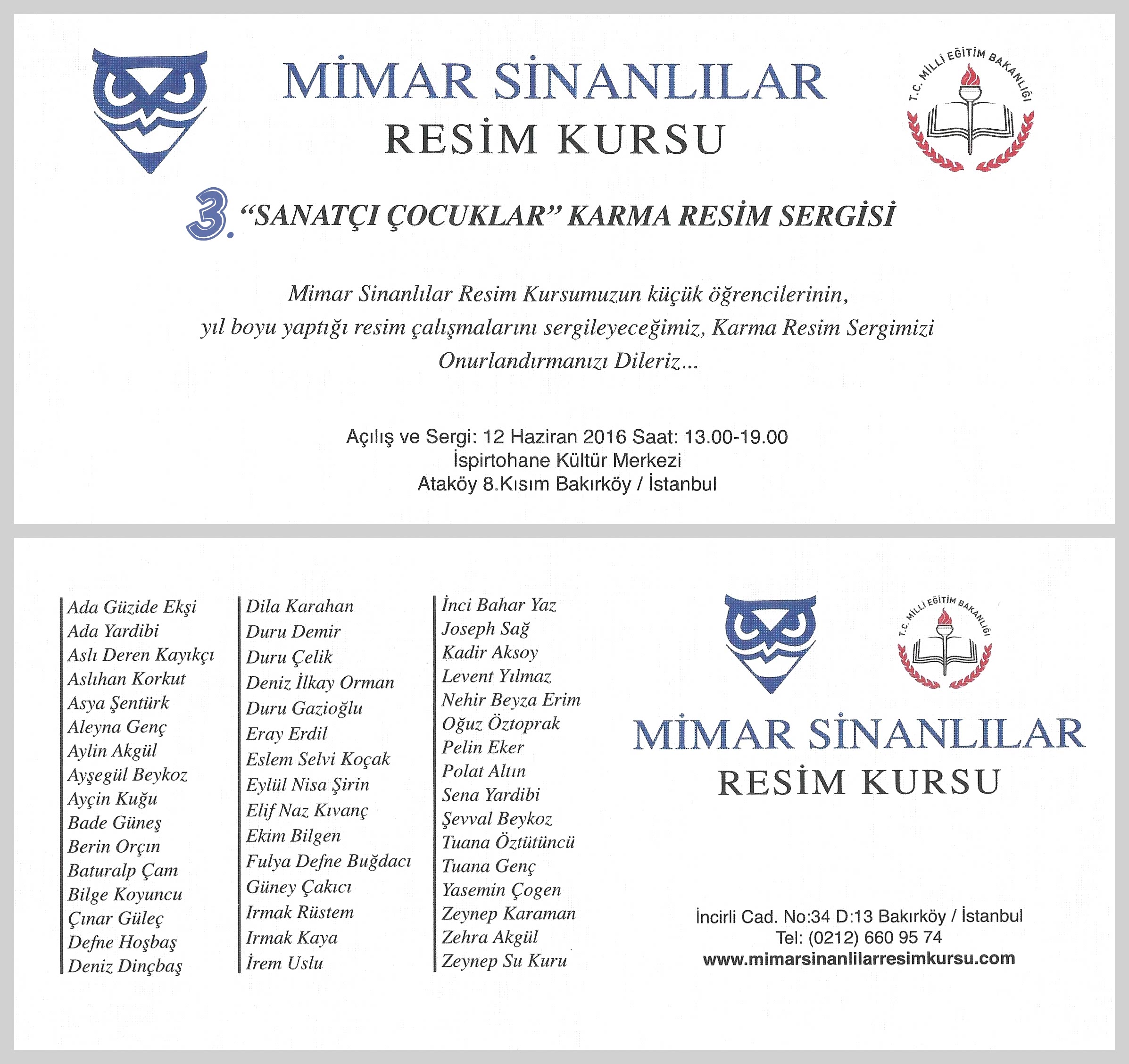Mimar Sinan Mezunları Resim Kursu ekibi olarak 3. "Sanatçı Çocuklar" Karma Resim Sergisine göstermiş olduğunuz ilgiden ötürü tüm velilere ve siz değerli misafirlerimize çok teşekkür ederiz.