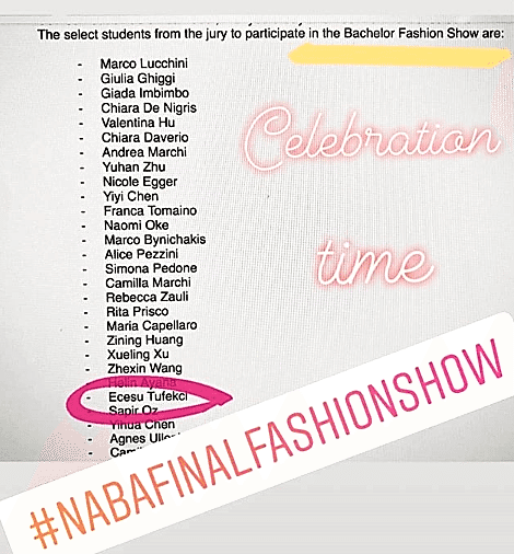 Öğrencimiz Ecesu Tüfekçi, Naba Üniversitesi (Milano) final defilesine 450 kişi arasından ilk 30'a girerek katılma hakkı kazandı.